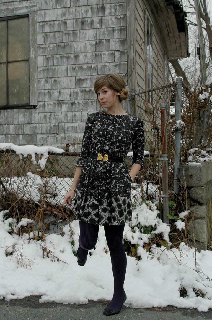 Yes, I definitely had a coat with me...it was very cold! Hello Winter! I felt like the pattern on my dress was vaguely reminiscent of snowflakes and therefore appropriate for the snowy day. I tend to forget all about this dress in the back of my closet, it's great though because the sleeves can be rolled down for winter and it has pockets. This is also my (lame) attempt at pattern mixing...where's the other pattern you're asking? My tights are lightly striped, see? I know, I know, don't go too crazy, right? I really admire people who can successfully mix and match patterns, but I have never been one of them. I'd like to start though, it would certainly open up my closet options a bit more. How do you feel about mixing patterns? Do you have any tips on how to pull it off?